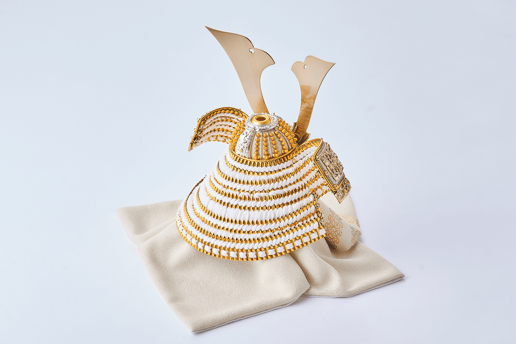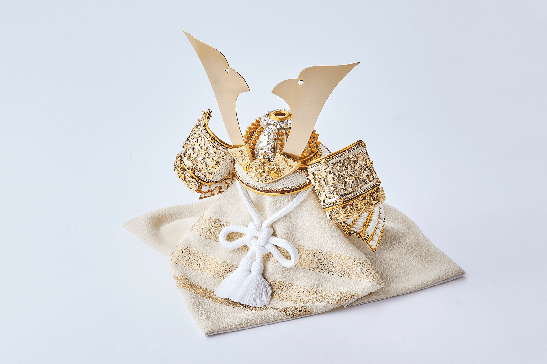 色は時代を映すものと言われますが、白と金色は千年の時を経てもその色の持つ清廉さと輝きを失うことなく私たちの文化を紡いできました。 この先も変わらぬであろう白と金のくすみのない組み合わせで考えた兜飾り。 兜の横には小さな桜飾りを添えて、一生のお守りだからこそ選んでほしい逸品。お家では端午の節句に向けて、何よりも輝きを放ち続けるお守りというシンボルとして想い出を紡いでいきます。