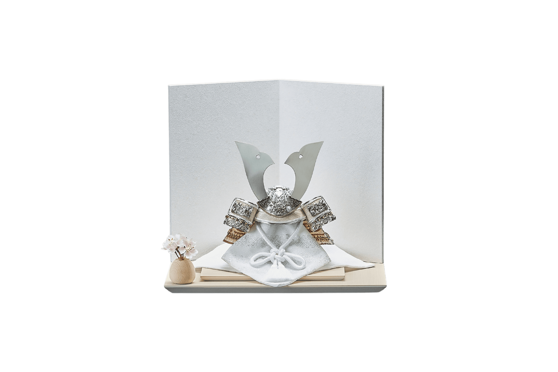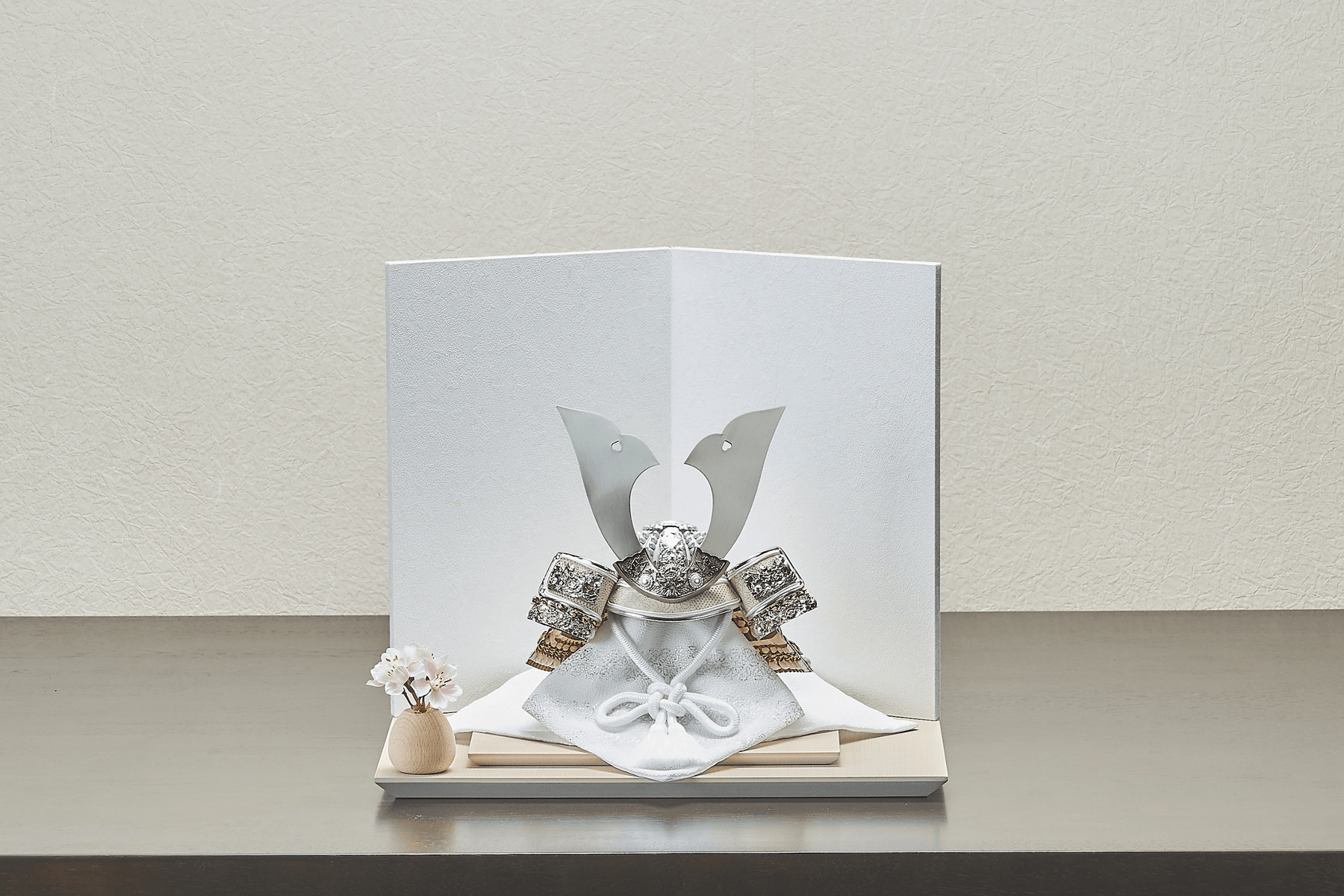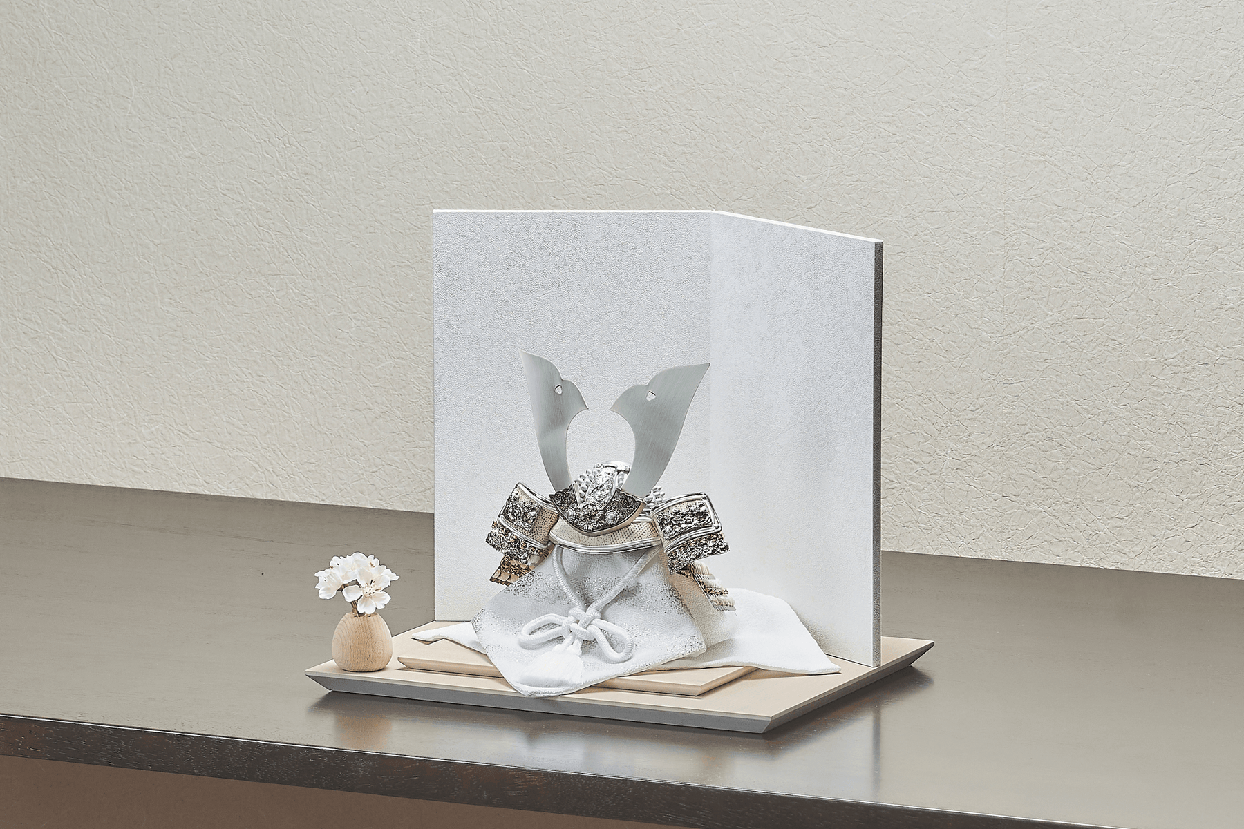 漆黒とは対称的に、光そのものをかたちにしたかのような兜飾り。ともすれば安っぽく見えてしまう白。品格と重厚さが削がれないよう、随所にあしらわれた白銀の輝き。確かな素材と作りこみが、安らぎと緊張感を同時に感じさせます。白を基調とした明るいご自宅のリビングに合わせたい、空間を整える季節のお飾り。この兜が象徴するのは、腕力ではない、清く誠実な心の強さです。