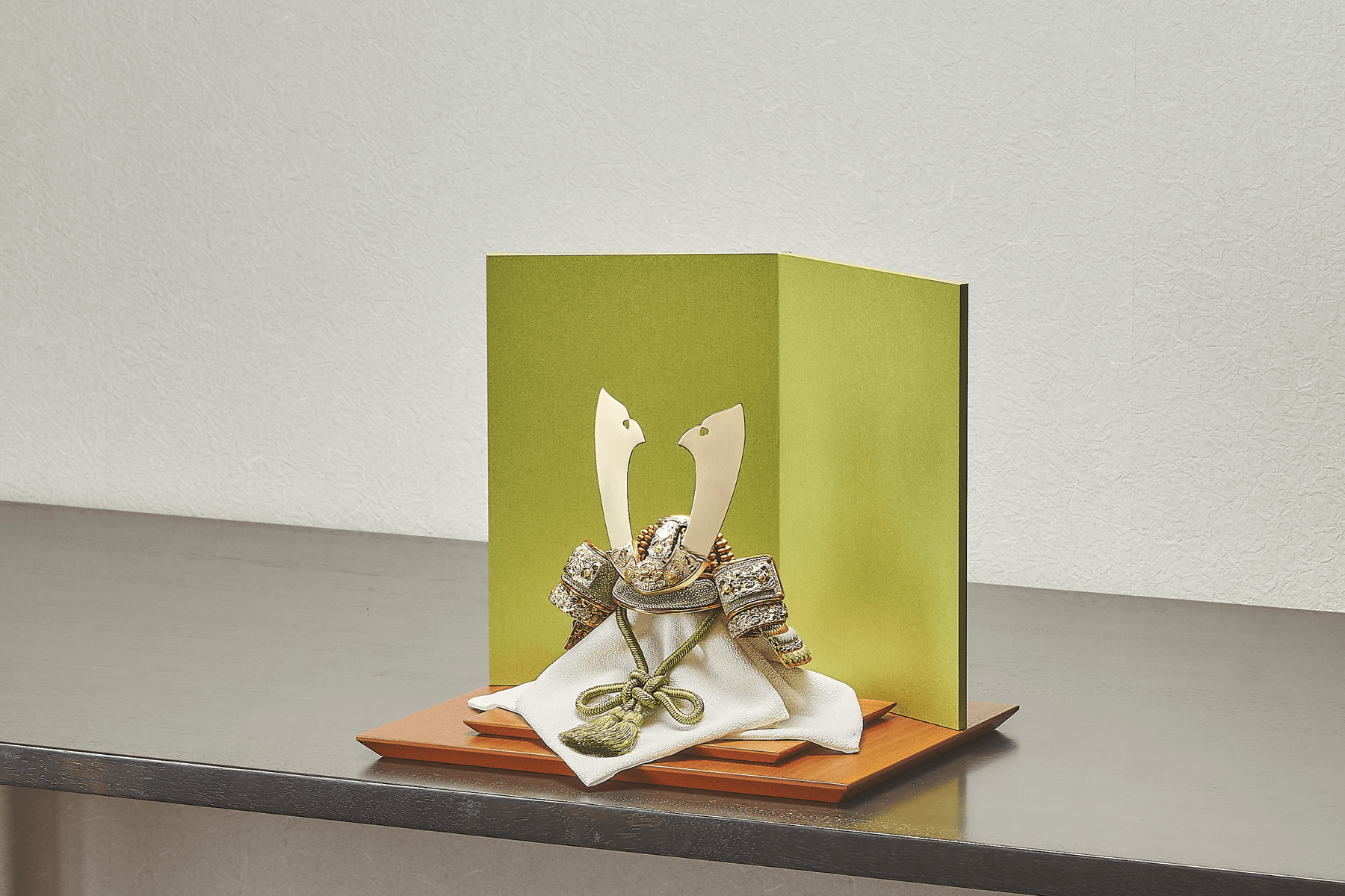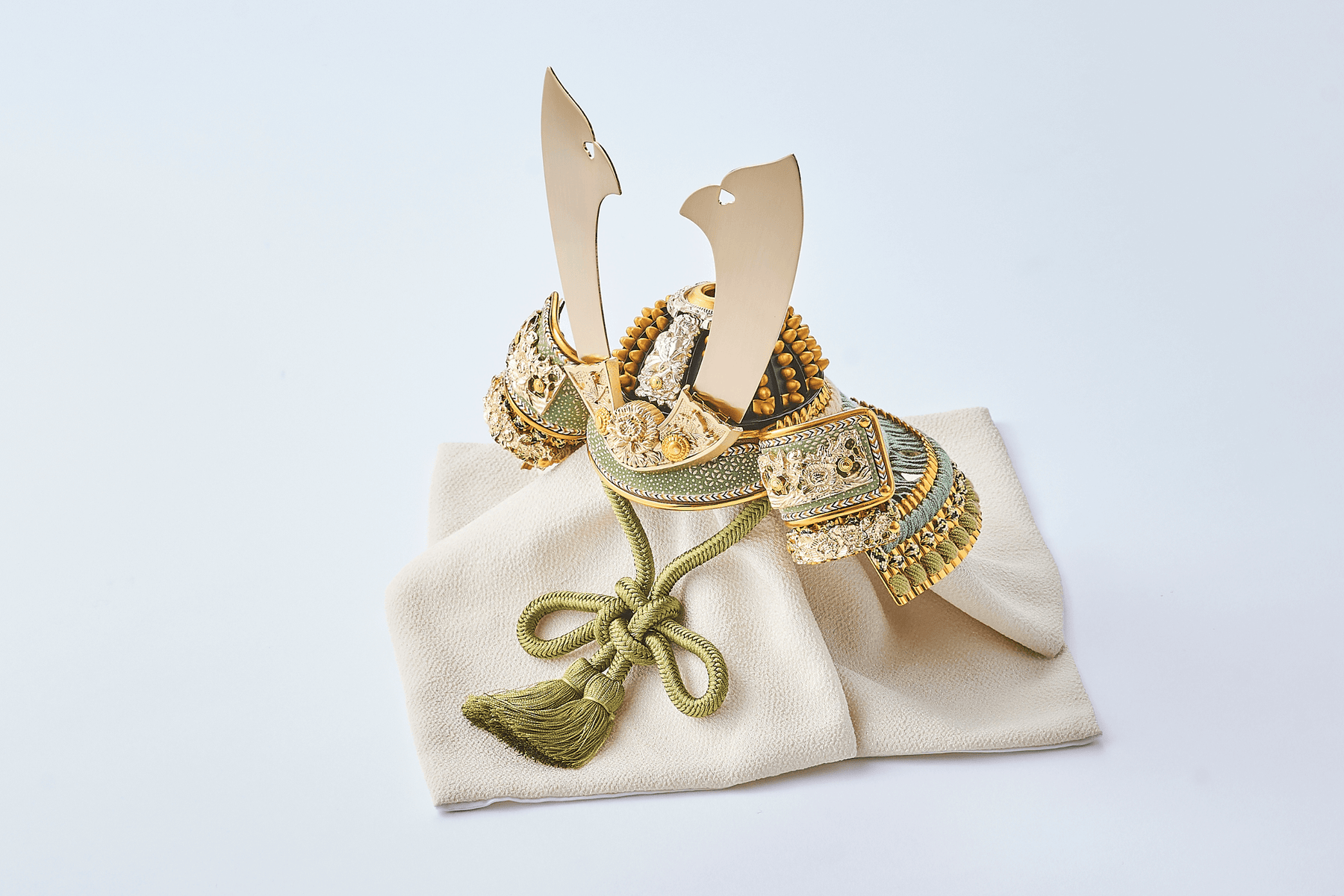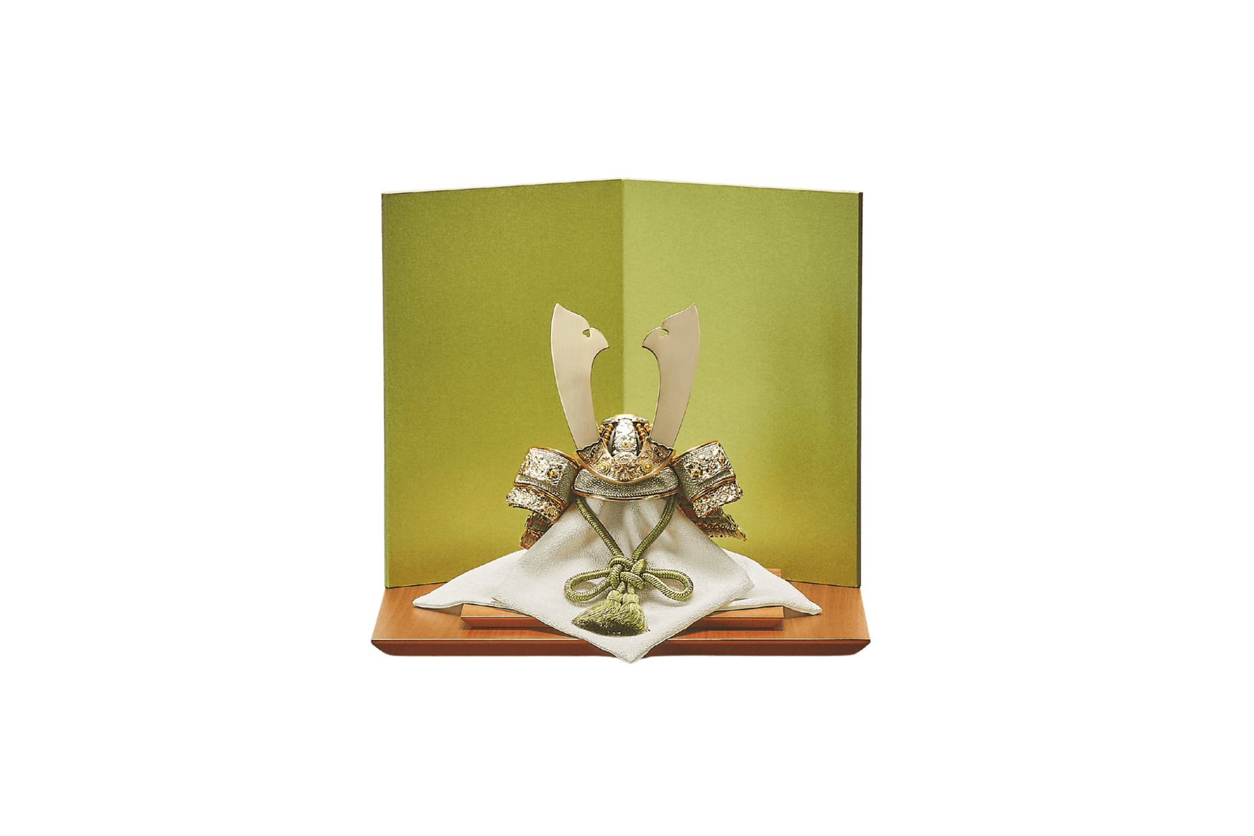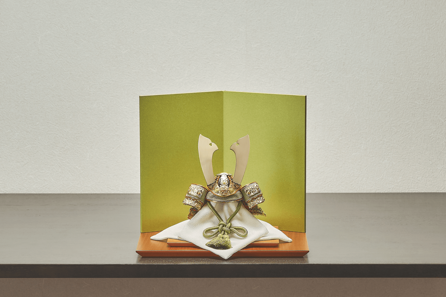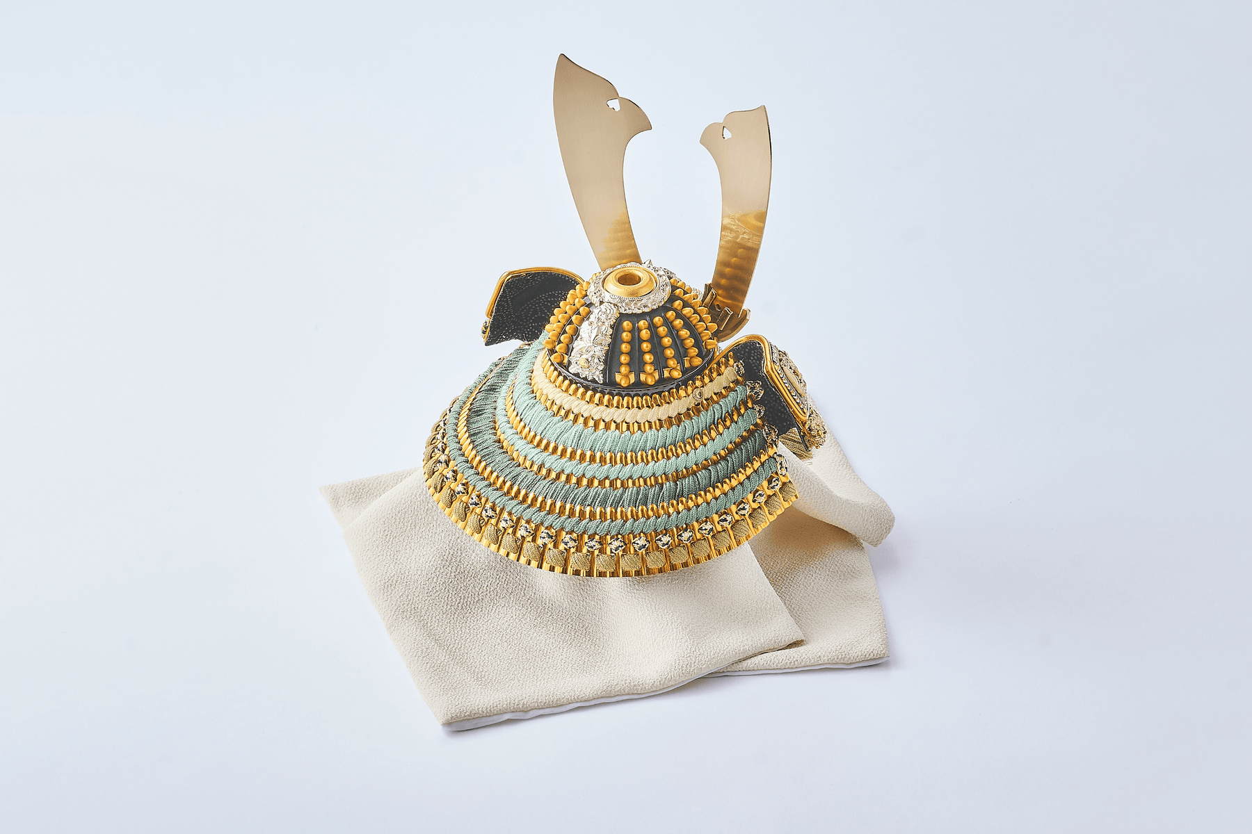 青から緑、そして深緑へ。とまらない成長の勢いを模した色合いの中で、ただシンプルに金色の兜が鎮座する。