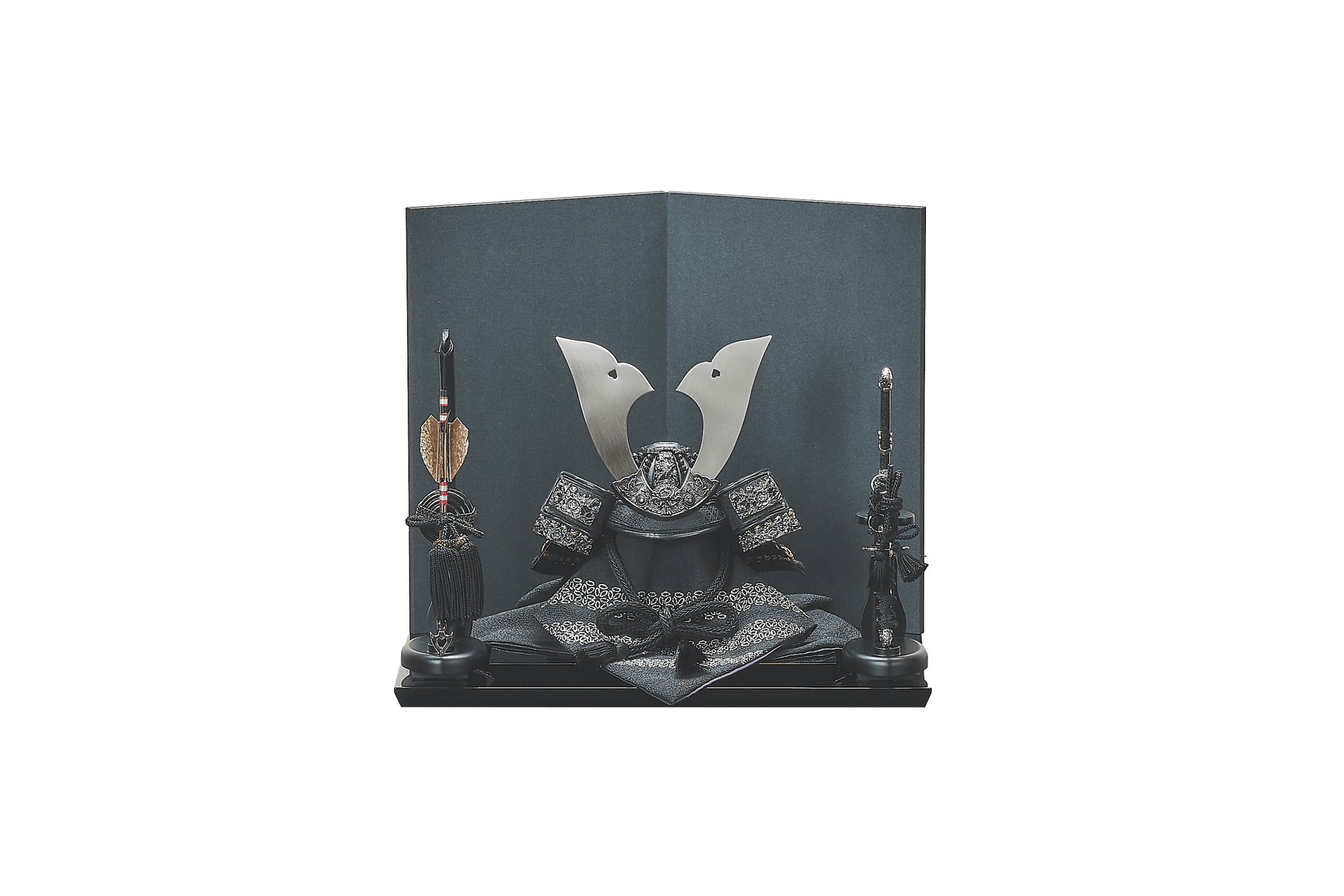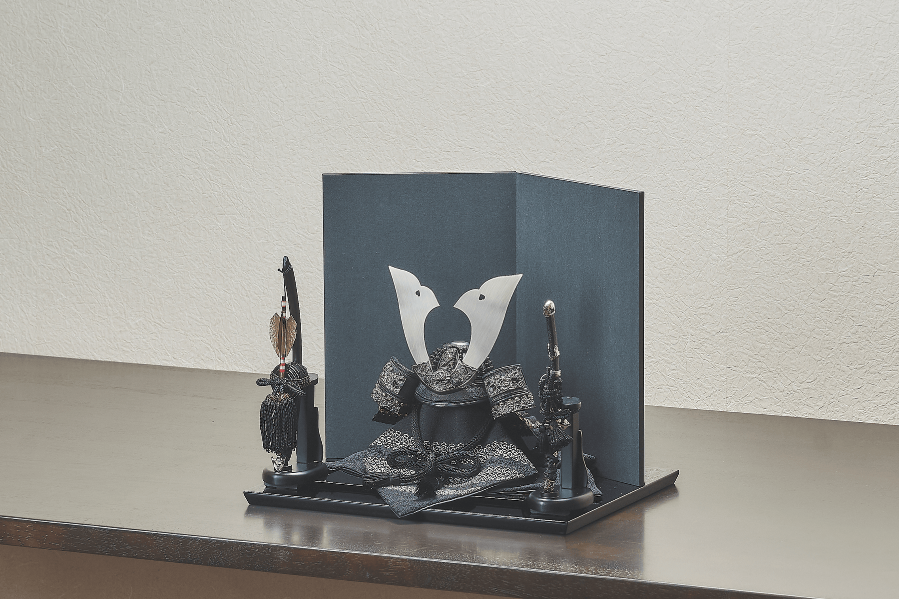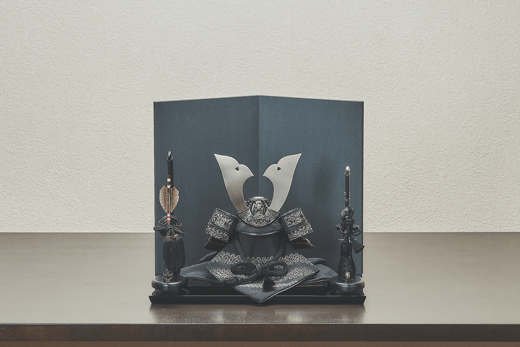兜としては珍しい「黒一色」の一揃いは、華美な装飾を潔く削ぎ落とし、本質的な美しさを追求しました。深く吸い込まれるような黒に差し込む白銀の光が、ギラギラとした輝きではなく、力強さと安定感を醸し出す。黒を基調としたご自宅のリビングや書斎に、一層洗練された空気の流れを作るでしょう。質実剛健という言葉が持つ、誠実で揺るぎない心のありようを、この兜は静かに教えてくれます。