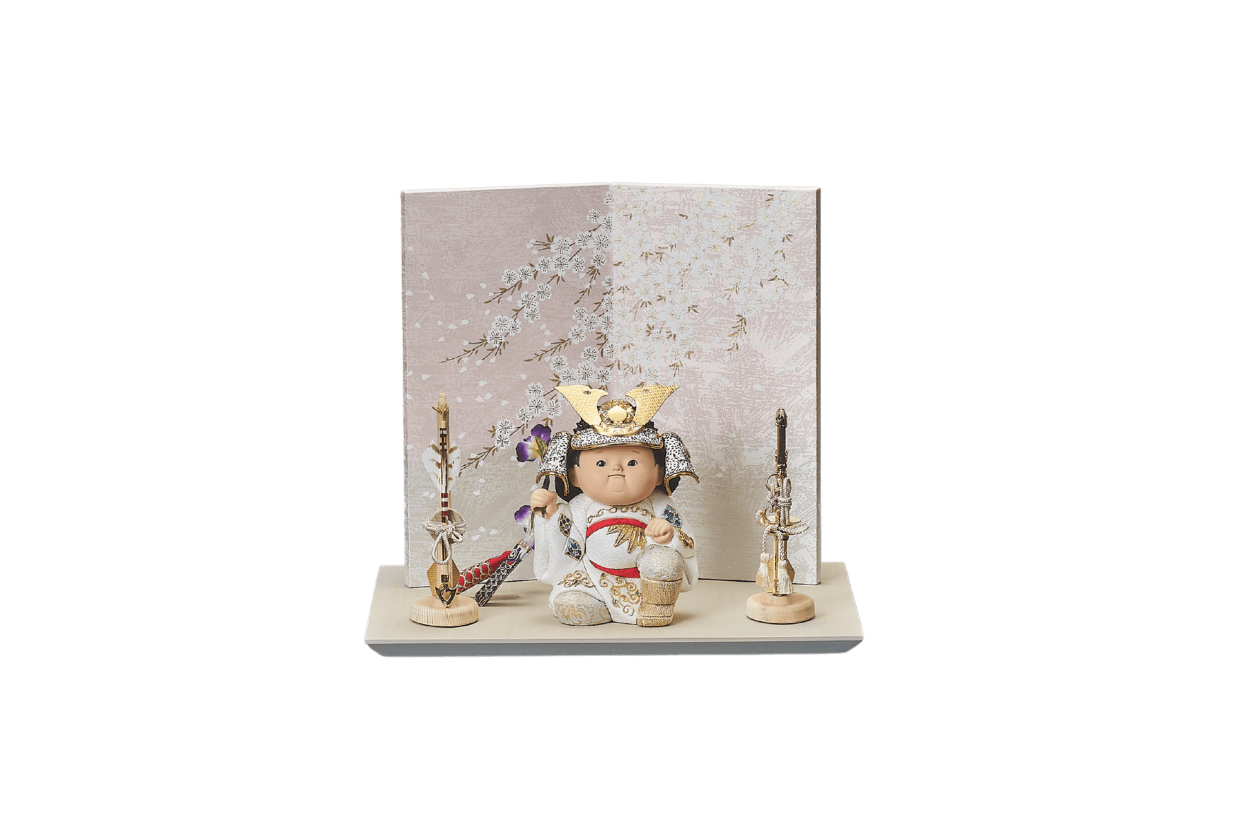 五月人形がまとう「強さ」の意味を、私たちはもう一度、見つめ直しました。右手に掲げた菖蒲と鯉のぼりは、腕力で勝利するためではなく、知性で未来を切り拓くためのしるしです。清らかな白の衣に浮かび上がるのは、金運と繁栄を呼び込む、縁起の良い「盛り上げ金彩」。唐草や鱗といった伝統文様が、お子様の人生を豊かに彩ることを祈ります。桜の木から染め上げた、優しい色の屏風は、既存の価値観にとらわれず、自分だけの自由な人生を謳歌してほしいという、最も深い願いの表れに他なりません。知性で成功を掴み、豊かさを手に入れ、桜のように自分らしく咲き誇る。そんな新しい時代のリーダーシップを願う、一揃いです。
