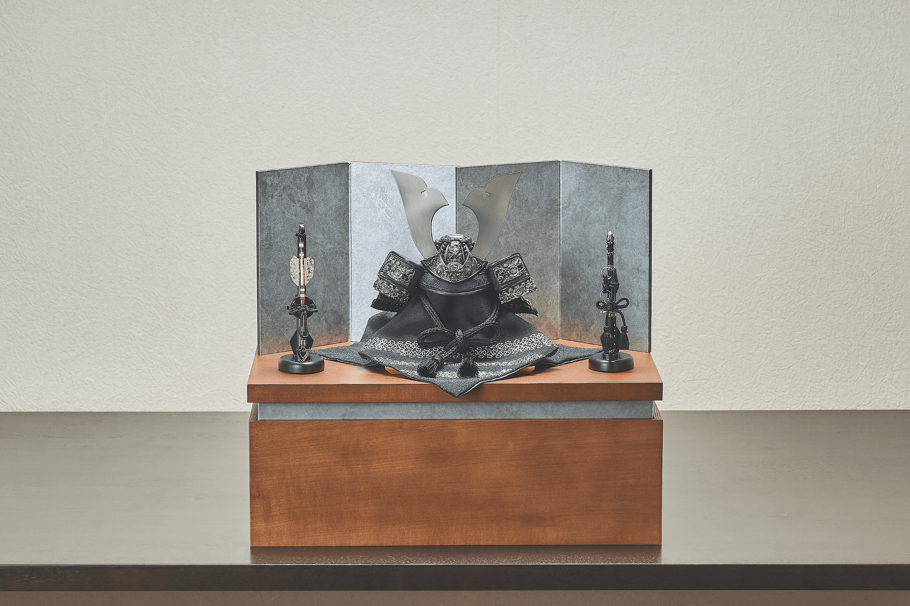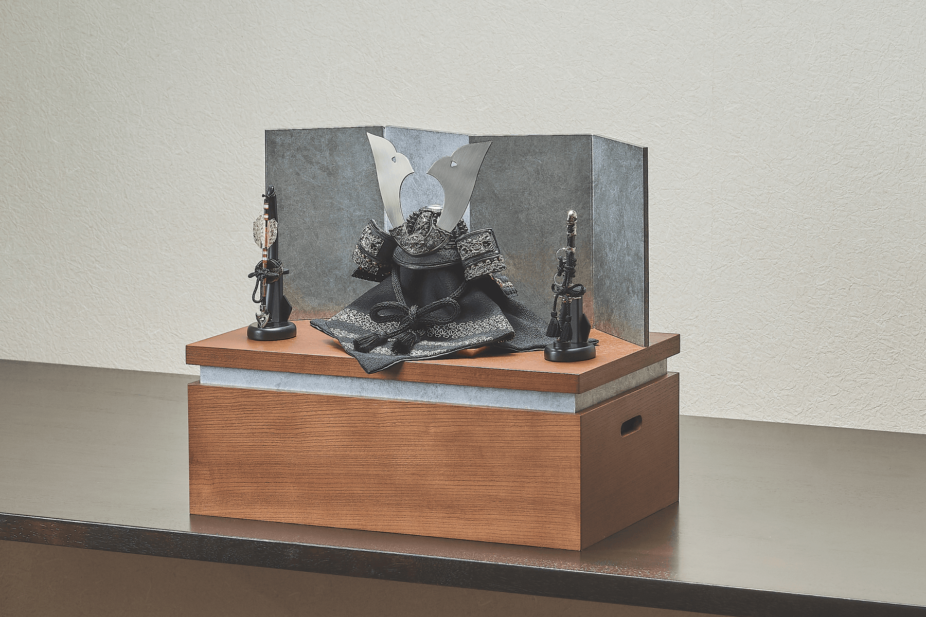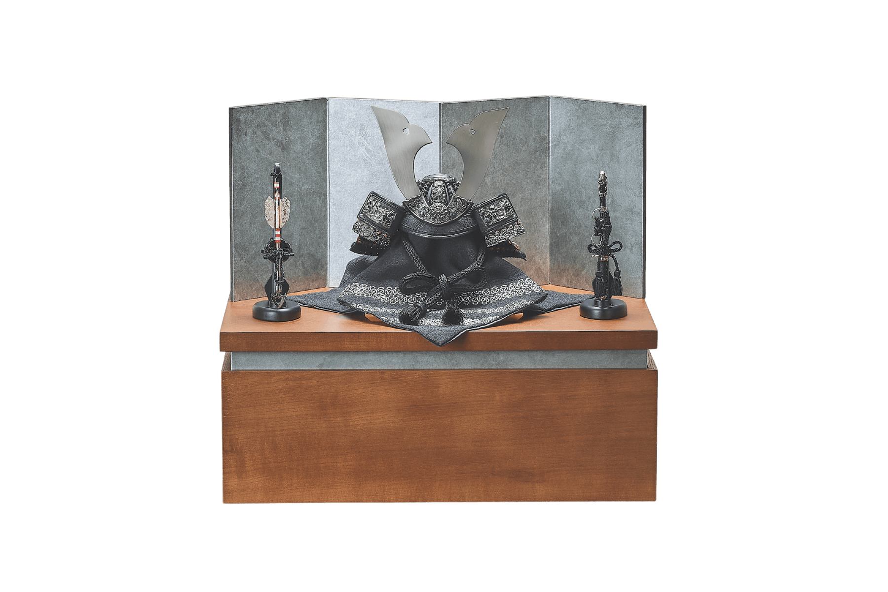 ウォールナットと錫(すず)色のシックな舞台に鎮座するのは、すべてを漆黒で仕立てた兜。金具さえも黒の濃淡で表現し、わずかな銀色のアクセントが、その静かな存在感を際立たせます。この重厚感を一つの箱に収めてお届けします。お子様の心に、見た目に惑わされない審美眼と、内に秘めた情熱が育まれることを願って。