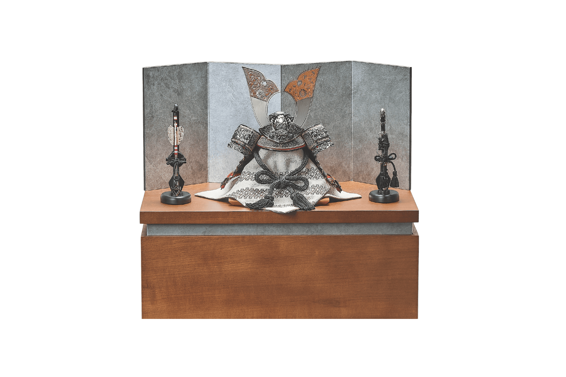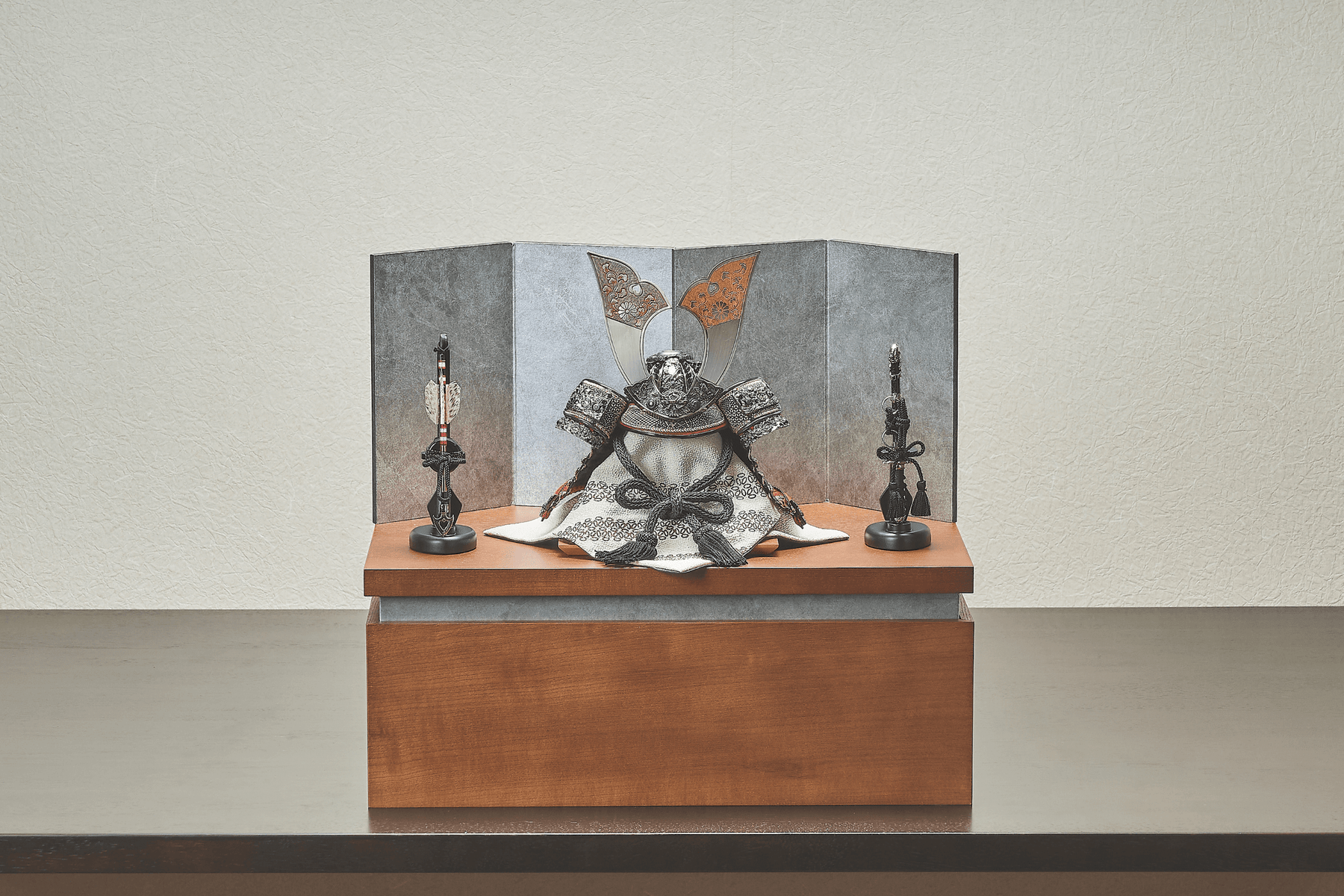 ウォールナットと、錫色のシックな組み合わせの舞台に鎮座するのは、深い紫をまとった本格仕立ての兜。裾にのぞく赤。鍬形に光る「鏨彫」の朱赤はどちらも魔除けの願いが込められた、意味のあるデザイン。この重厚感を一つの箱に収めていただけます。お子様の心に、見た目に惑わされない審美眼と、内に秘めた情熱が育まれることを願って。