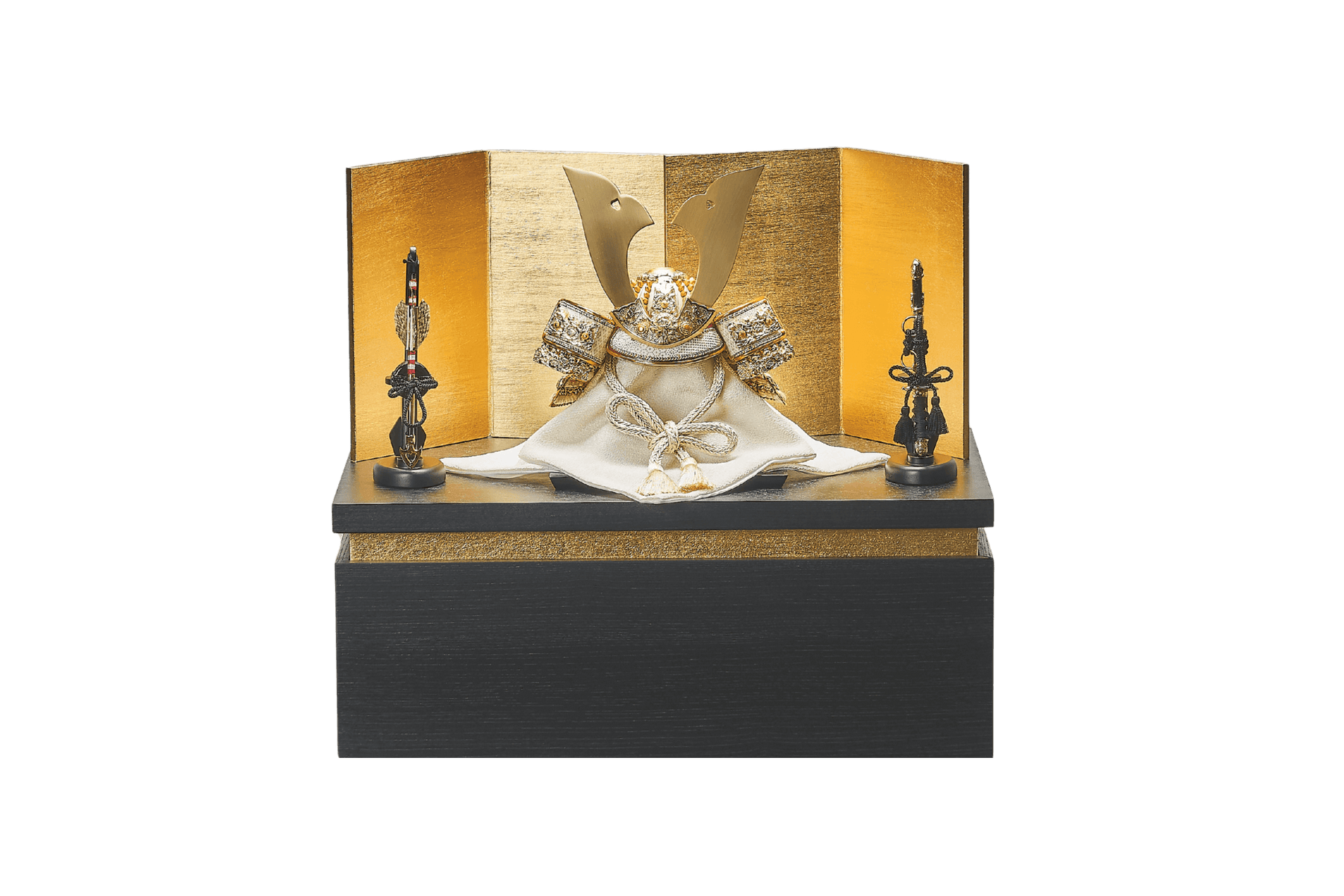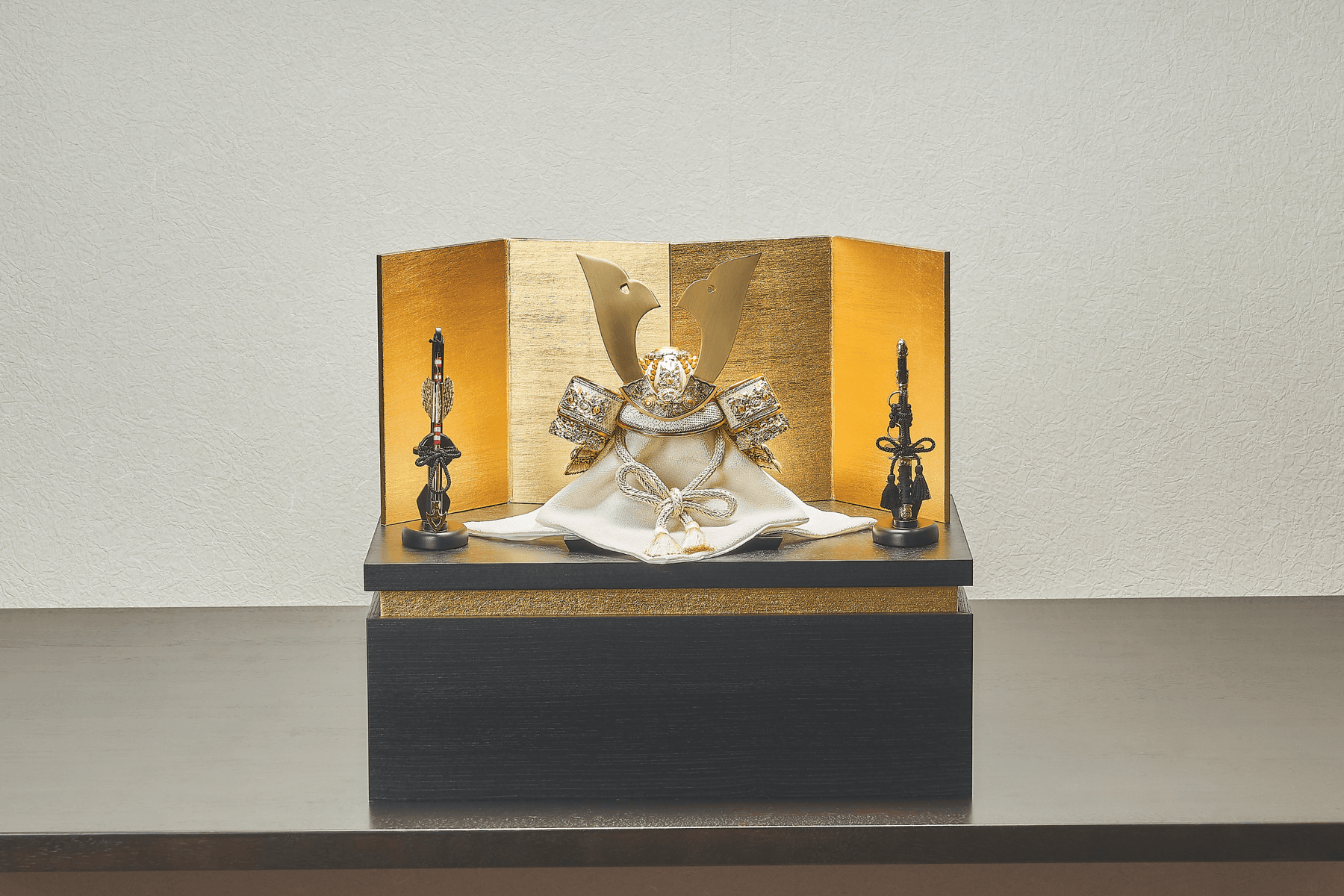 シックな艶消しの黒塗りの箱に、上品な「流れ金色箔」の屏風。その力強いコントラストの中に、あえて柔らかな淡い「秘色(ひそく)」の兜を合わせました。重厚な黒と金の世界だからこそ、兜の優しい色合いが際立つ。その鮮やかな「メリハリ」が、見る人の目を惹きつけます。すべてが一箱に収まる、現代の暮らしに寄り添う一揃いです。