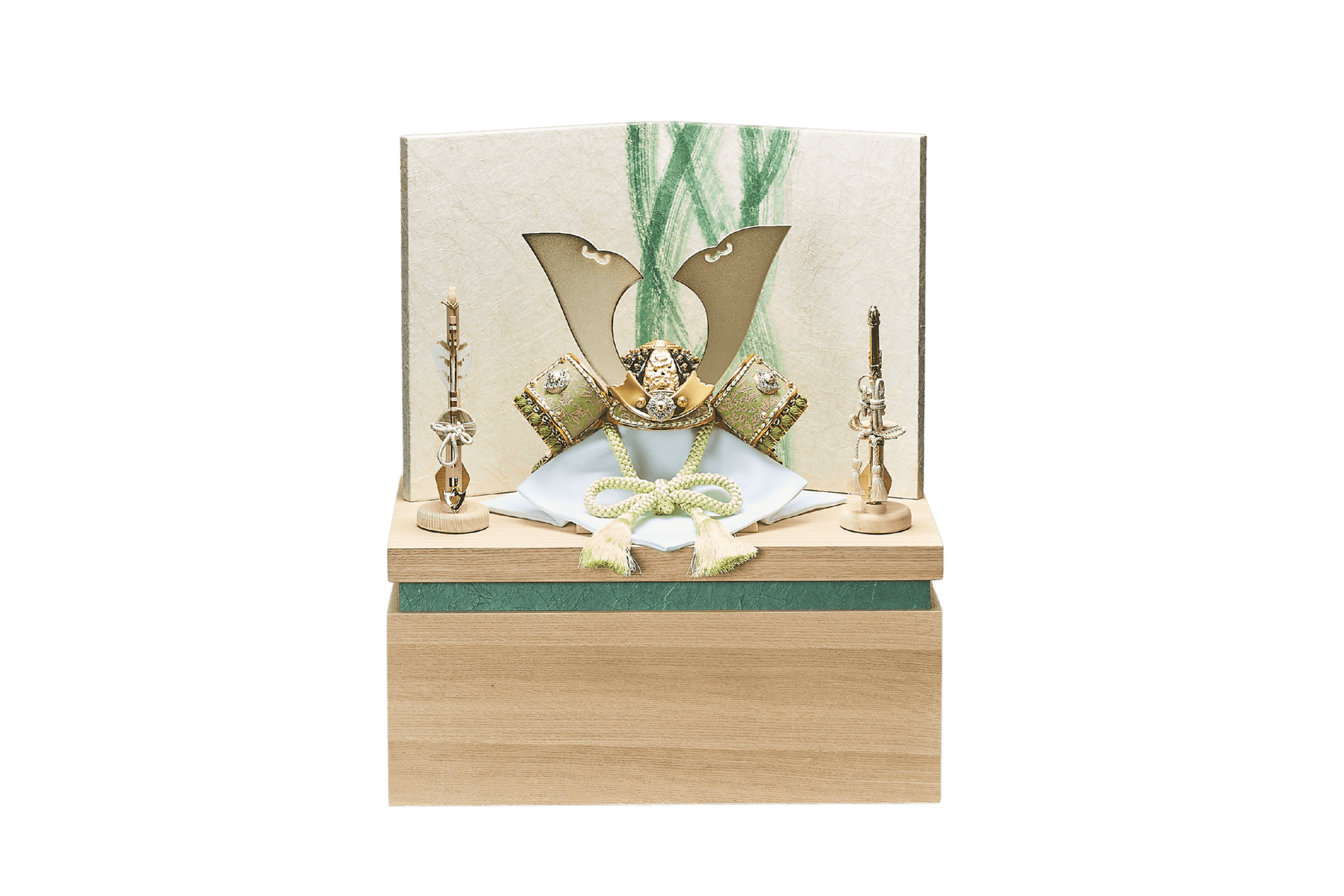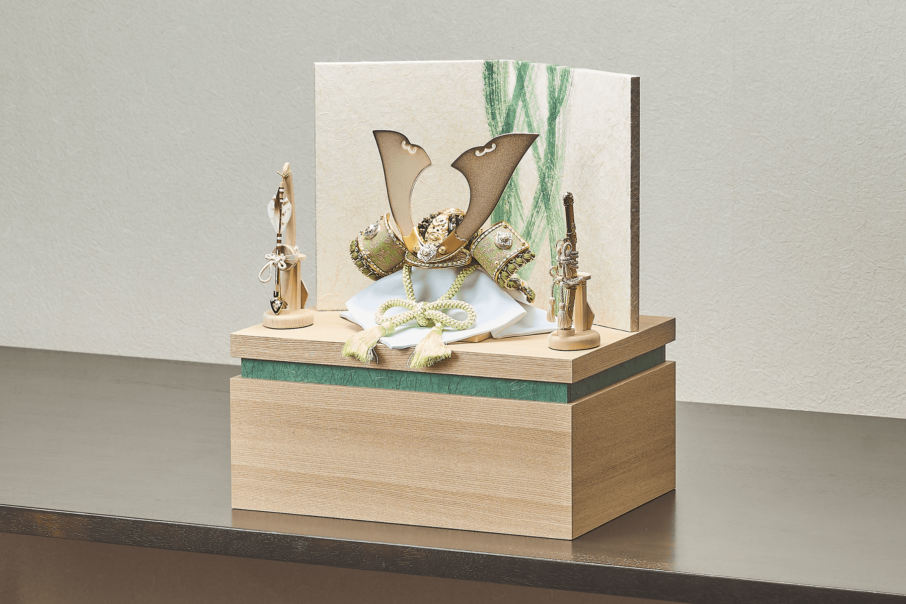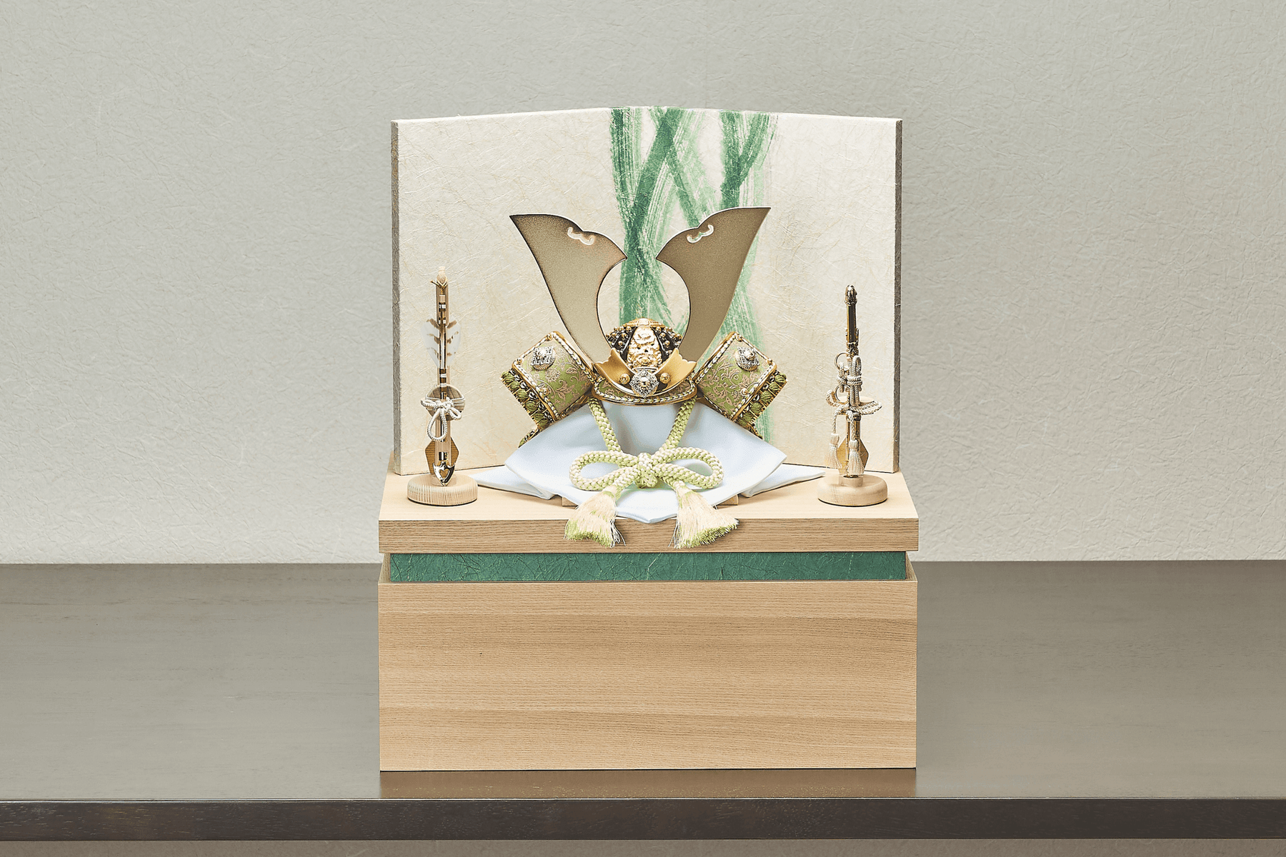 萌え立つような若葉色の風。堂々たる「大鍬形」の兜。本来は力感あふれるそのフォルムも、生命力に満ちた若葉色をまとうことで、重々しさを感じさせない、実に晴れやかな表情を見せてくれます。伝統的な「端午の緑」というテーマを踏まえながら、現代の暮らしに心地よく馴染む、この軽やかさが魅力です。