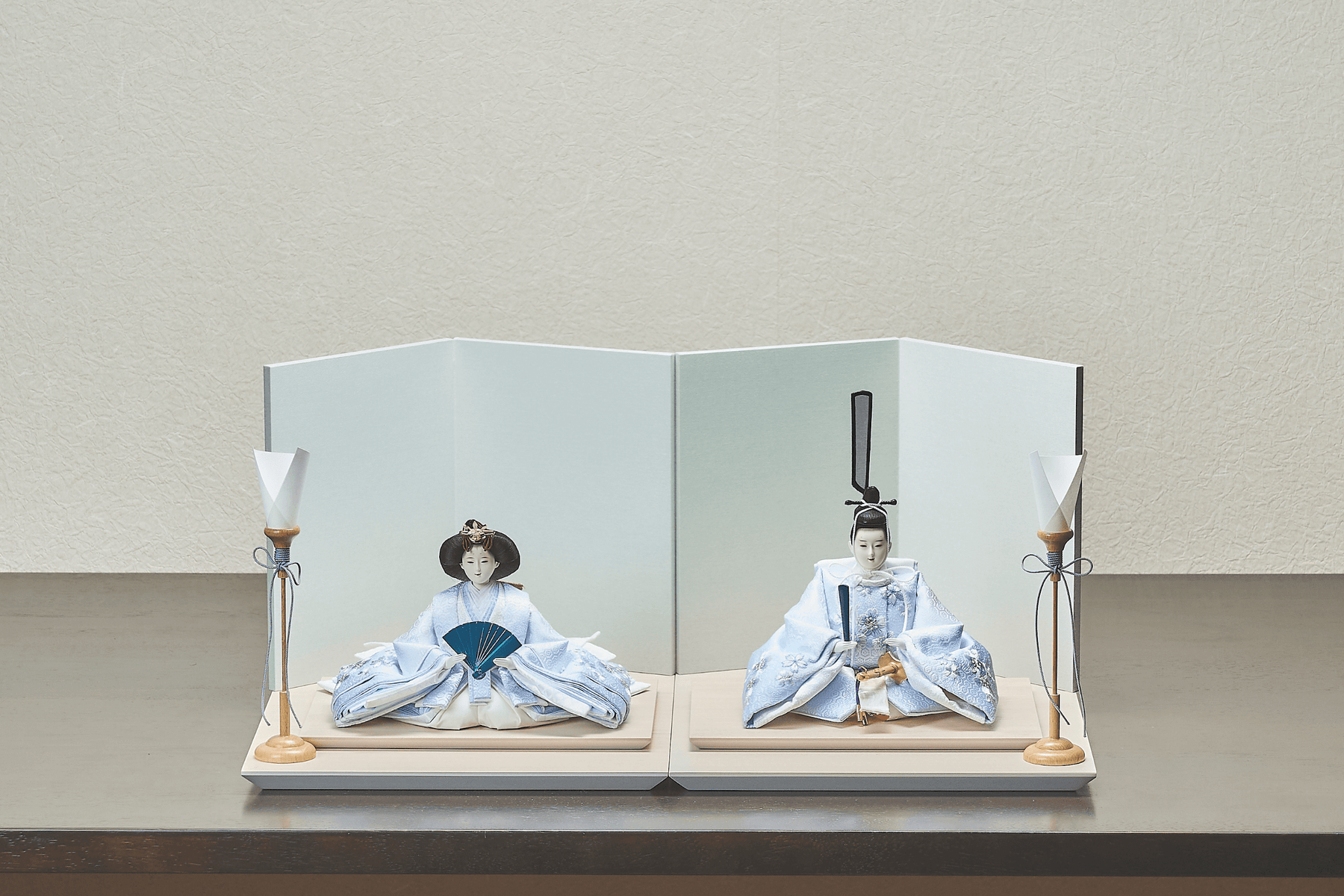 静かな青を基調としたお揃いの衣裳に浮かぶ、凛とした桜の文様。モダンなリビングにも静かに溶け込み、見る人の感性を刺激します。