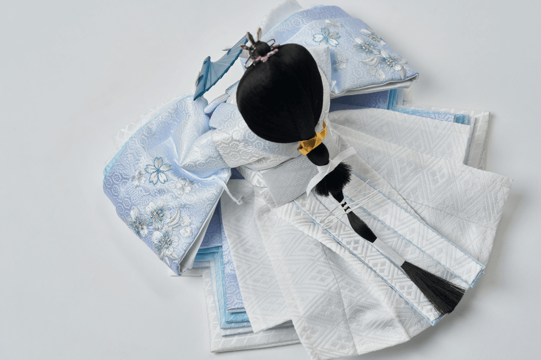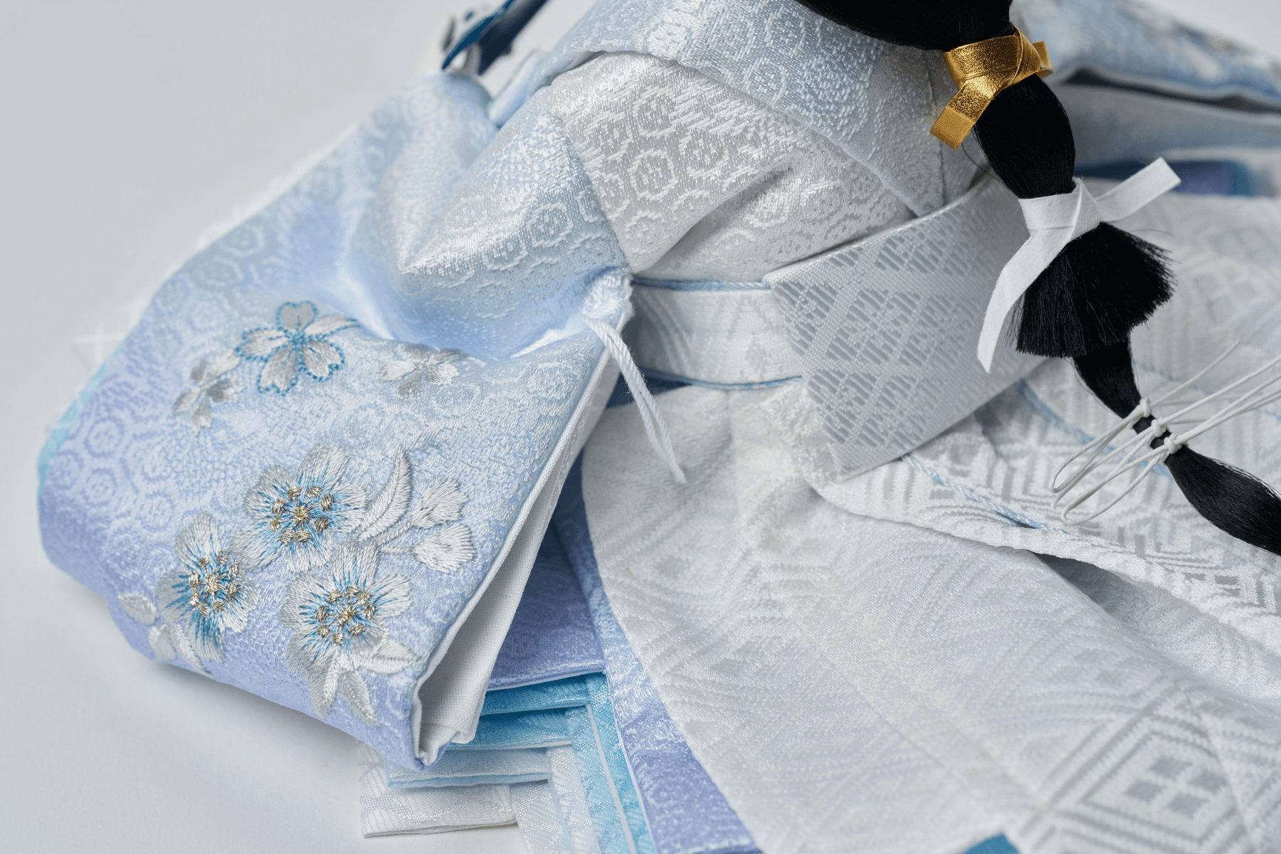 どこを探しても見つからない、唯一無二の雛飾り。その象徴が、この「氷桜」のお着物です。
