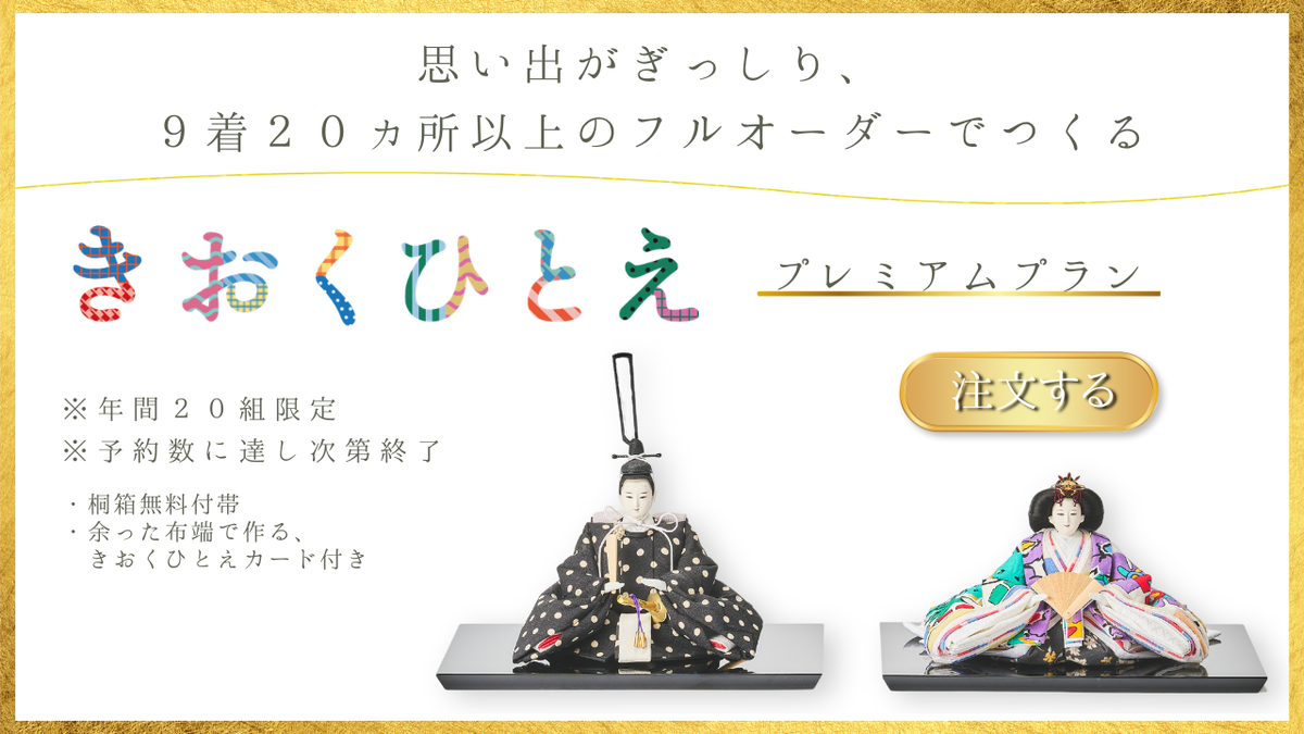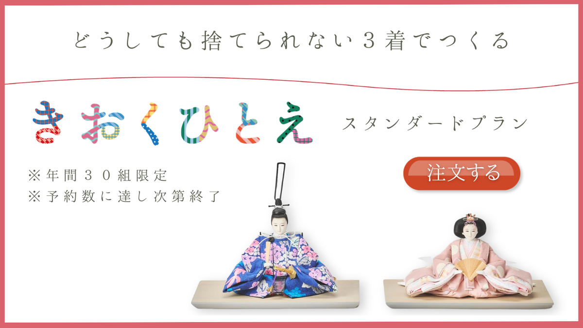 思い出の詰まった世界に一つだけのひな人形としてお楽しみいただける、きおくひとえのスタンダードプランです。衣装に使用する服を3着セレクトいただき、それらを素材に上質なひな人形に仕上げます。